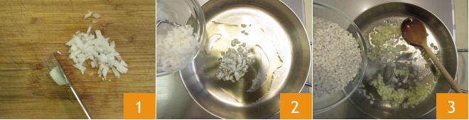 Um den Risotto al Telefono zuzubereiten, bereiten Sie zuerst die Gemüsebrühe zu und halten Sie sie warm. Zuerst schneiden Sie die Schalotte klein 1. Geben Sie einen Schuss Öl in einen Topf, fügen Sie die Schalotte hinzu 2 und lassen Sie sie weich werden. Geben Sie den Reis in den Topf 3 und rösten Sie ihn für einige Minuten an.