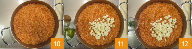 Sobald der Reis gar ist 10, stellen Sie die Hitze ab und fügen Sie die Mozzarella hinzu, einen Schuss Öl 11 und die Majoranblätter 12.