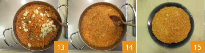 Rühren Sie den Risotto 13, bis der Käse gut geschmolzen ist und eine cremige Konsistenz hat 14. Servieren und genießen Sie ihn noch warm 15.