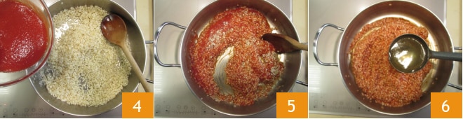 Fügen Sie dann die Tomatenpassata hinzu 4 und mischen Sie alles gut 5. Beginnen Sie, den Risotto zu kochen, indem Sie etwas Brühe hinzufügen 6,