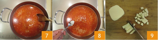 so dass der Reis bedeckt ist 7. Salzen Sie je nach Salzgehalt der Brühe 8 und kochen Sie, indem Sie bei Bedarf weitere Brühe hinzufügen und oft umrühren. Insgesamt dauert es etwa 18 Minuten, ab dem Zeitpunkt, an dem Sie den Reis mit Brühe bedecken. Die Zeiten variieren jedoch je nach Reissorte, probieren Sie häufig, um die Garzeit zu überprüfen. Schneiden Sie die Mozzarella in Würfel 9 und stellen Sie sie beiseite.