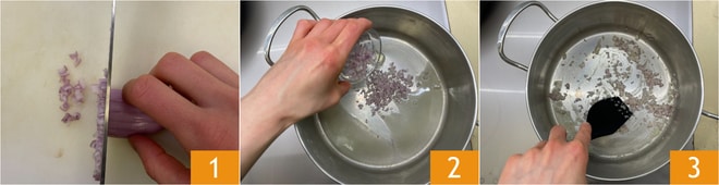 Um den Risotto mit Rotwein und Wurst zuzubereiten, bereiten Sie zuerst die Gemüsebrühe nach unserem Rezept zu und halten Sie sie warm. Schälen und schneiden Sie die Schalotte in kleine Würfel 1. In einem Topf die 20 g Butter schmelzen, die Schalotte hinzufügen 2 und bei mittlerer Hitze 5-6 Minuten anbraten, bis sie durchsichtig wird 3.
