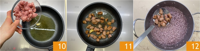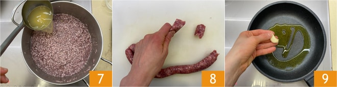 Fügen Sie jeweils eine Kelle heiße Brühe hinzu 7 und garen Sie den Reis, bis er al dente ist. Das dauert etwa 14 Minuten, aber folgen Sie den Angaben auf der Verpackung. In der Zwischenzeit kümmern Sie sich um die Wurst, entfernen die Haut und brechen sie in kleine Stücke 8. In einer Antihaft-Pfanne das Öl erhitzen und den Knoblauch hinzufügen 9.