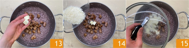 Fügen Sie die Butter hinzu 13 und den geriebenen Parmesan 14. Decken Sie den Topf mit einem Deckel ab 15 und lassen Sie es 2 Minuten ruhen.