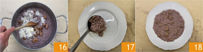 Rühren Sie um 16 und richten Sie es an 17. Ihr Risotto mit Rotwein und Wurst ist bereit, genossen zu werden 18.