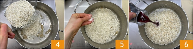 Geben Sie den Reis in den Topf 4, salzen Sie 5 und rösten Sie ihn 2 Minuten, dabei ständig umrühren, bis die Körner glänzend werden. Mit Rotwein ablöschen 6 und den gesamten Alkohol verdampfen lassen.
