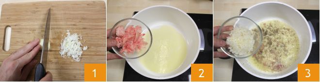 Um den Risotto mit Amarone zuzubereiten, beginnen Sie damit, die Schalotte fein zu hacken 1. In einem Kochtopf 30 g Butter zusammen mit dem Rinderknochenmark schmelzen 2, die Schalotte hinzufügen und mit einer Schöpfkelle Fleischbrühe anschwitzen 3.