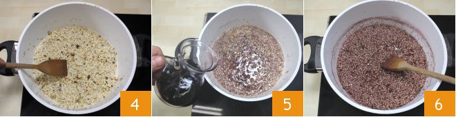 Den Reis hinzufügen und gut rösten 4, dann den Amarone nach und nach in zwei-drei Schritten einfließen lassen, wobei darauf gewartet wird, dass der bereits hinzugefügte Wein gut absorbiert ist 5. Dies dauert mindestens 5 Minuten, währenddessen Sie mit einem Holzlöffel umrühren 6.