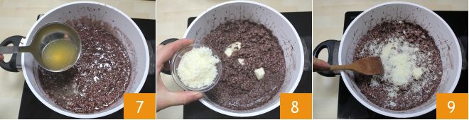 Setzen Sie das Garen des Risottos bei schwacher Hitze fort, indem Sie nach und nach die Fleischbrühe hinzufügen 7. Wenn der Reis al dente ist, schalten Sie die Hitze aus und verfeinern Sie den Risotto mit den restlichen 30 g Butter und dem geriebenen Monte Veronese Käse 8, wobei Sie mit einem Löffel umrühren 9. Der Risotto mit Amarone ist bereit, serviert zu werden!