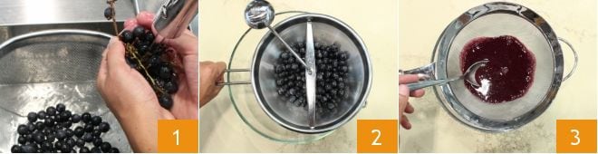 Um den Risotto mit Erdbeertrauben zuzubereiten, entfernen Sie zuerst die Trauben von den Rispen und spülen Sie sie gründlich unter fließendem Wasser ab 2. Pürieren Sie die Trauben durch eine Passiermaschine 2, wobei Sie einige zur Dekoration des Gerichts beiseite halten. Dann sieben Sie die Mischung durch ein Sieb 3.