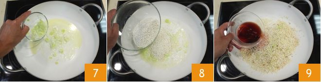 Geben Sie dann den zuvor geschnittenen Lauch hinzu 7, braten Sie ihn einige Minuten an und geben Sie dann den Reis dazu. Rühren Sie ständig um und rösten Sie den Reis einige Minuten, löschen Sie dann mit einem Glas Rotwein ab und lassen Sie ihn verdampfen.