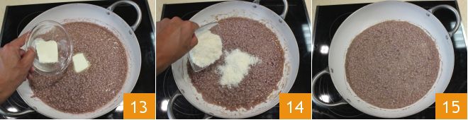 Nach dem Kochen mit Salz abschmecken, den Topf vom Herd nehmen und den Risotto mit der restlichen Butter 13 und geriebenem Grana Padano DOP 14 abmengen. Ihr Risotto mit Erdbeertrauben ist fertig 15, servieren Sie es heiß und garnieren Sie es mit einigen Erdbeertrauben.