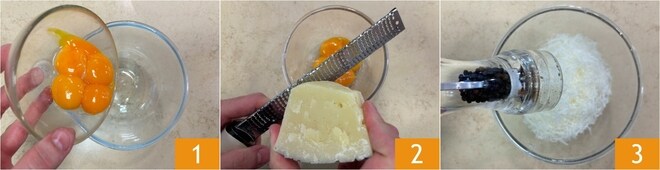 Um das Risotto alla Carbonara zuzubereiten, bereiten Sie zunächst die Gemüsebrühe zu und halten Sie sie warm. Geben Sie die Eigelbe in eine Schüssel 1, dann fügen Sie den geriebenen Pecorino 2 und den Pfeffer 3 hinzu.
