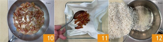 Lassen Sie den Guanciale bei schwacher Hitze etwa 10 Minuten schwitzen 10. Wenn er knusprig und goldbraun ist, aus der Pfanne nehmen und auf Küchenpapier abtropfen lassen 11. Nun den Reis in einen Topf geben 12 und trocken rösten, dabei häufig umrühren.