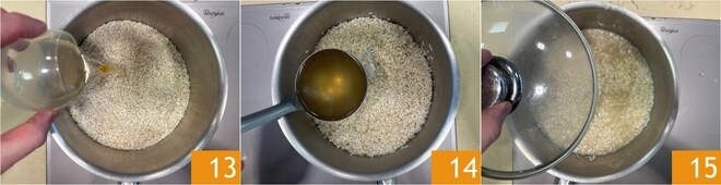 Mit dem Weißwein ablöschen 13 und den Alkohol vollständig verdampfen lassen, dann den Reis unter Zugabe eines Schöpflöffels heißer Brühe nach und nach garen, dabei immer darauf achten, dass die Flüssigkeit absorbiert wurde, bevor Sie die nächste hinzufügen 14. Drei Viertel der angegebenen Garzeit abwarten, das Feuer ausschalten, mit einem Deckel abdecken 15 und 3 Minuten ruhen lassen.