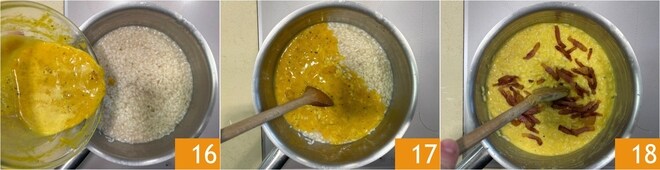 Nach dieser Zeit die Mischung aus Eiern und Pecorino hinzufügen 16 und gut umrühren 17, dann etwa die Hälfte des gerösteten Guanciale hinzufügen und erneut vermengen 18.