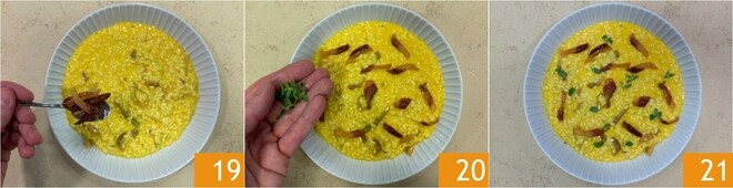 Anrichten und mit dem restlichen Guanciale 19 und einigen Majoranblättern 20 garnieren. Ihr Risotto alla Carbonara ist bereit zum Servieren 21!