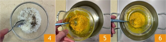 Gut vermischen 4, dann die Schüssel über ein Wasserbad stellen 5 und bei mittlerer bis niedriger Hitze weiter rühren, bis die Mischung cremig ist 6.