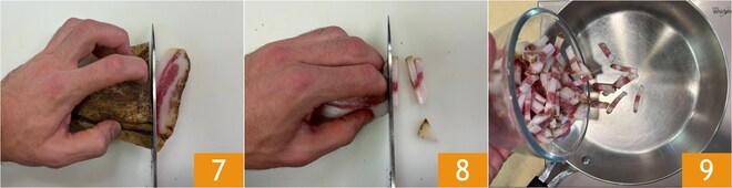 Zur Seite stellen und sich dem Guanciale widmen: Nachdem Sie die Schwarte entfernt haben, schneiden Sie ihn zuerst in Scheiben 7 und dann in Streifen 8. Geben Sie den Guanciale in eine bereits erhitzte Pfanne 9.