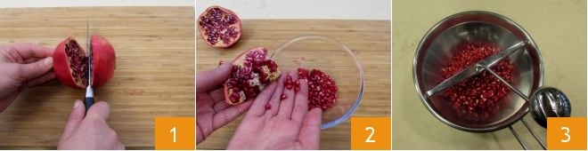 Um das Granatapfelrisotto mit Lauchcreme zuzubereiten, beginnen Sie mit der Zubereitung der Gemüsebrühe, dann entkernen Sie den Granatapfel: Schneiden Sie die Frucht mit einem Messer ein, um sie in zwei Hälften zu teilen 1, nehmen Sie dann die Körner heraus 2 und bewahren Sie etwa 20 g für die endgültige Dekoration auf. Den Rest können Sie mit einem Passiergerät passieren, um den Saft in einer kleinen Schüssel aufzufangen 3.