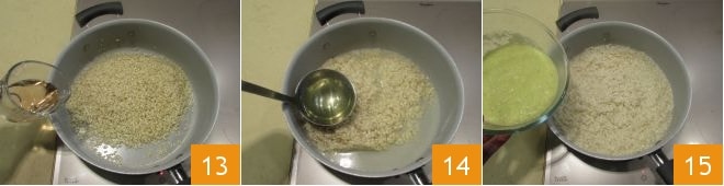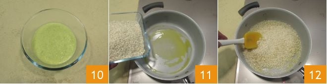 Bewahren Sie dann die Lauchcreme beiseite 10. Jetzt zum Reis übergehen: In einem großen Topf das Öl erhitzen, den Reis hinzugeben 10, um ihn bei mittlerer Hitze zu rösten, und dabei umrühren, damit er nicht am Boden haftet 12.