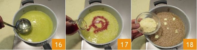 Gießen Sie noch 1 oder 2 Kellen Gemüsebrühe hinzu 16, wenn diese leicht aufgenommen ist, geben Sie den Granatapfelsaft hinzu 17 und rühren Sie weiter. Schalten Sie die Hitze ab und fügen Sie die in kleine Stücke geschnittene Butter und den geriebenen Grana Padano DOP hinzu 18, um alles zu vermengen.
