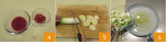 Bewahren Sie den Granatapfelsaft und die ganzen Körner beiseite 4. Fahren Sie dann mit der Zubereitung der Lauchcreme fort: Entfernen Sie den grünen Teil und die Bartwurzeln des Lauchs, schälen Sie die erste Schicht und schneiden Sie ihn in Scheiben 5. In einer Pfanne das Öl erhitzen und den Lauch hinzufügen, damit er bei niedriger Hitze weich wird 6