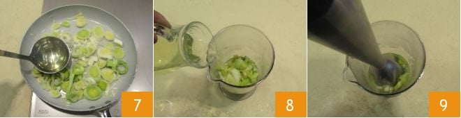 Fügen Sie eine Kelle Gemüsebrühe hinzu, um das Garen zu erleichtern: Es dauert etwa 5-10 Minuten. Salzen und pfeffern Sie am Ende des Garvorgangs, dann schalten Sie die Hitze aus und lassen Sie es leicht abkühlen. Sobald es fertig ist, geben Sie es in ein hohes Glas, fügen Sie etwa 200 g Gemüsebrühe hinzu 8 und pürieren Sie es mit einem Stabmixer 9: Sie sollten eine cremige und homogene Masse erhalten.