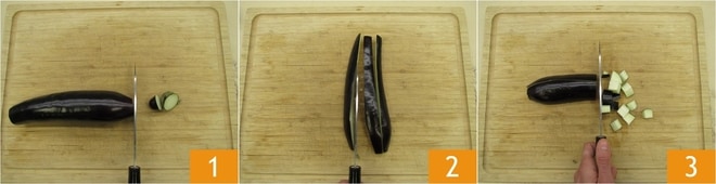 Um den Risotto alla Norma zuzubereiten, bereitet als erstes die Gemüsebrühe zu und haltet sie warm. Kümmert euch dann um die Auberginen: waschen und die Enden abschneiden 1. Schneidet sie zuerst in Scheiben 2 und dann in Würfel von etwa einem cm 3