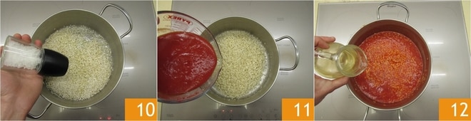 Gebt eine Prise Salz hinzu 10, so dass sich die einzelnen Körner gut würzen. Röstet den Reis bei mittlerer bis hoher Hitze, indem ihr ihn oft umrührt, etwa 3 Minuten lang. Nach dem Rösten gebt die ganze Tomatensauce dazu 11. Achtet darauf, da es spritzen könnte. Rührt oft um, damit der Reis nicht klebt, und passt die Flamme an, damit das Kochen nicht zu heftig ist. Nach 5 Minuten fügt die Hälfte der heißen Gemüsebrühe hinzu 12.