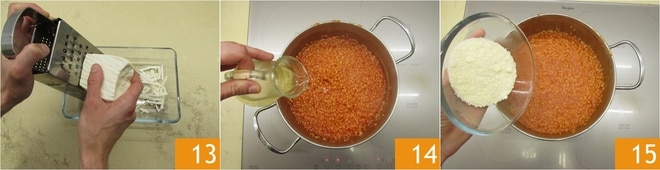In der Zwischenzeit reibt den gesalzenen Ricotta 13 und den Grana, wobei ihr den Reis immer im Auge behaltet und oft umrührt. Zur Hälfte der Kochzeit gießt die restliche Brühe hinein 14. Nach dem Kochen des Reises, würzt bei Bedarf mit Salz, schaltet das Feuer aus und rührt um. Gebt den Grana hinzu 15.
