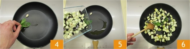 In einer Antihaftpfanne erhitzt 30 g Öl, fügt eine geschälte Knoblauchzehe und einige Basilikumblättchen hinzu 4. Gebt die Auberginen hinein 4, würzt mit Salz und rührt um 6