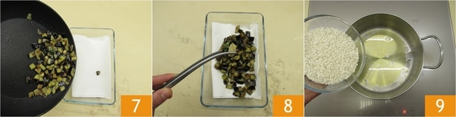 Kocht sie etwa 10 Minuten bei hoher Hitze, wenn sie schön goldbraun sind, übertragt sie auf eine mit Küchenpapier ausgelegte Auflaufform 7, entfernt den Knoblauch 8 und stellt sie beiseite. Beginnt nun mit dem Kochen des Reises, in einem weiten Topf mit hohem Rand erhitzt einen Spritzer Öl und gebt den Reis hinzu 9.