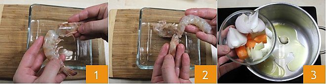 Um das Risotto mit Garnelen zuzubereiten, reinigen Sie zunächst die Garnelen, indem Sie ihre Köpfe entfernen 1 und die Panzer bis zum Schwanz schälen 2. Trennen Sie die Garnelen von den Schalen, die Sie beiseite legen, um den Fond zuzubereiten. Waschen und reinigen Sie das Gemüse für den Fond gut, schneiden Sie es in Stücke und braten Sie es bei mittlerer Hitze in einem großen Topf mit etwas Öl an 3.