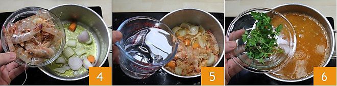 Fügen Sie die Schalen und Köpfe der Garnelen hinzu 4, lassen Sie sie ein paar Minuten kochen und drücken Sie die Köpfe mit einem Holzlöffel, um alle Säfte herauszudrücken. Geben Sie das Wasser 5 und die Petersilienzweige 6 hinzu und lassen Sie es bei mäßiger Hitze köcheln. Bei Bedarf können Sie nach Geschmack salzen.