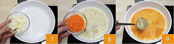 Während der Fond kocht, nehmen Sie eine Antihaftpfanne und schmelzen Sie darin die Butter 7, dann dünsten Sie die fein gehackte Schalotte und Karotte an 8, mit einer Kelle Wasser, um das Gemüse zu erweichen 9.