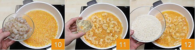 Sobald das Gemüse angedünstet ist, fügen Sie die geschälten Garnelen hinzu 10, braten Sie sie bei hoher Hitze an; wenn sie ihre Flüssigkeit freigesetzt haben, löschen Sie sie mit Weißwein ab und lassen Sie ihn verdampfen 11. Reduzieren Sie die Hitze und fügen Sie den Reis hinzu, den Sie ein paar Minuten rösten lassen 12.