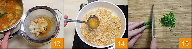 In der Zwischenzeit filtern Sie den Fischfond 13 und fügen ihn dem Risotto nach und nach hinzu 14. Kochen Sie den Reis etwa 18 Minuten bei mittlerer Hitze und geben Sie mehr Fond hinzu, sobald der Reis die vorherige Flüssigkeit aufgenommen hat. In der Zwischenzeit hacken Sie den Schnittlauch fein 15.