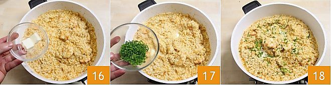 Nach Beendigung der Kochzeit nehmen Sie das Risotto vom Herd, fügen die Butter und den gehackten Schnittlauch hinzu (16-17) und verfeinern das Risotto. Servieren Sie Ihr Risotto mit Garnelen sofort: Guten Appetit!