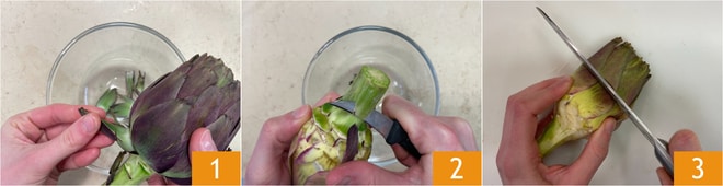 Um das Safranrisotto mit Artischocken und Ziegenkäse zuzubereiten, reinigen Sie zuerst die Wie man Artischocken putzt: Entfernen Sie die äußeren Blätter 1, kürzen Sie dann den Stiel und schälen Sie ihn in der Nähe der Basis 2. Schneiden Sie die Spitzen ab 3 und teilen Sie die Artischocke in zwei Hälften.