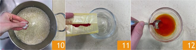 Salzen Sie 10 und kochen Sie den Reis, indem Sie ihn nach und nach mit einer Kelle heißem Wasser begießen und warten, bis die Flüssigkeit absorbiert ist, bevor Sie mehr hinzufügen. In der Zwischenzeit geben Sie den Safran in eine kleine Schüssel mit etwas lauwarmem Wasser 11 und rühren Sie, um ihn aufzulösen 12.