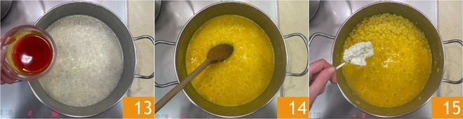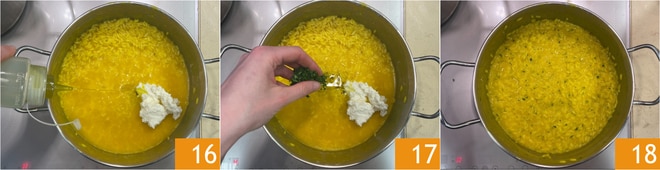 Wenn noch 5 Minuten bis zum Ende der Risottogarzeit verbleiben, fügen Sie den aufgelösten Safran hinzu 13 und mischen Sie gut 14. Sobald das Risotto fertig ist, schalten Sie die Hitze aus und mischen Sie es mit der Hälfte des Ziegenkäses 15.