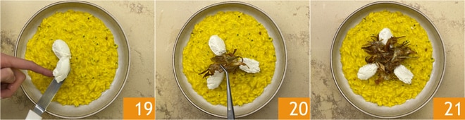 Richten Sie das Safranrisotto an, formen Sie dann mit dem restlichen Ziegenkäse drei Nocken und legen Sie diese in die Mitte 19. Schließlich garnieren Sie mit den frittierten Artischocken 20. Ihr Safranrisotto mit Artischocken und Ziegenkäse ist bereit, serviert zu werden 21!