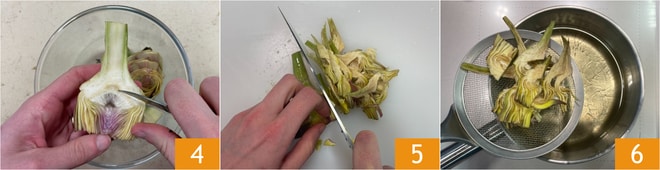 Entfernen Sie schließlich das Bartinnere 4 und schneiden Sie die Artischocken in dünne Scheiben 5. Legen Sie die geschnittenen Artischocken in säuerlich angesäuertes Wasser oder frittieren Sie sie sofort im Samenöl bei 180 °C für etwa 2-3 Minuten 6.