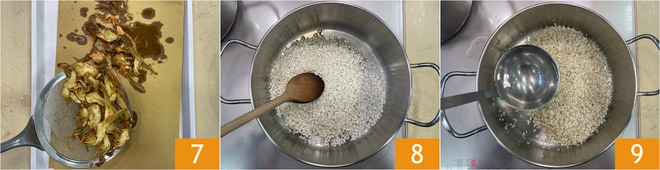 Wenn sie knusprig und goldbraun sind, lassen Sie die Artischocken abtropfen und legen Sie sie auf Küchenpapier 7. Beiseite stellen und einen Topf mit Wasser zum Kochen bringen, das Sie zum Kochen des Risottos verwenden. Rösten Sie den Reis in einem Topf mit einem Schuss Öl 8, dann löschen Sie mit einer Kelle heißem Wasser ab 9.