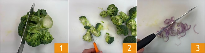 Um den Risotto mit Brokkoli und Sardellen zuzubereiten, reinigen Sie zuerst die Brokkoli und entnehmen Sie die Röschen 1, teilen Sie sie dann in zwei Hälften 2. Schneiden Sie die Schalotte fein 3.
