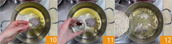 Geben Sie den Knoblauch 10 und die halbierte frische Chili 11 hinzu. Lassen Sie alles für 2 Minuten ziehen, dann entfernen Sie Knoblauch und Chili. Geben Sie den Reis in den Topf 12.