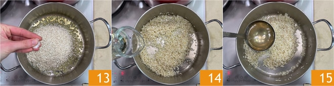 Würzen Sie mit Salz 13 und lassen Sie den Reis für 2 Minuten rösten, oder bis die Reiskörner leicht durchscheinend werden. Löschen Sie mit Weißwein ab 14 und lassen Sie den gesamten Alkohol verdampfen. Fügen Sie Gemüsebrühe hinzu 15 und bringen Sie den Reis unter häufigem Rühren zum Garen. Geben Sie eine Kelle Brühe hinzu, wenn die vorherige aufgesogen wurde.