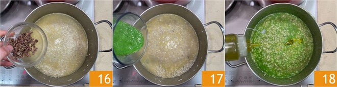Hacken Sie die Sardellen fein, lassen Sie ein paar ganz für das Anrichten. Wenn noch 5 Minuten der Garzeit verbleiben, fügen Sie die gehackten Sardellen 16, die Brokkolicreme 17 hinzu und vollenden Sie das Garen. Schalten Sie die Hitze aus, fügen Sie das Öl 18 hinzu und rühren Sie alles cremig.