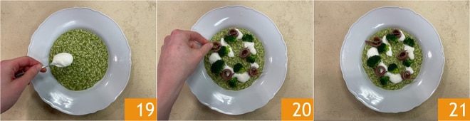Richten Sie das Gericht an und vervollständigen Sie es mit ein paar Löffeln saurer Sahne 19, ein paar Brokkoli-Röschen und den ganzen Sardellen 20. Ihr Risotto mit Brokkoli und Sardellen ist servierfertig 21!